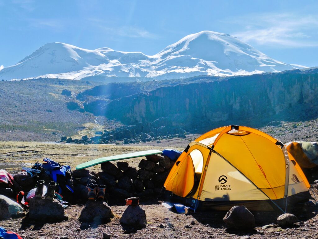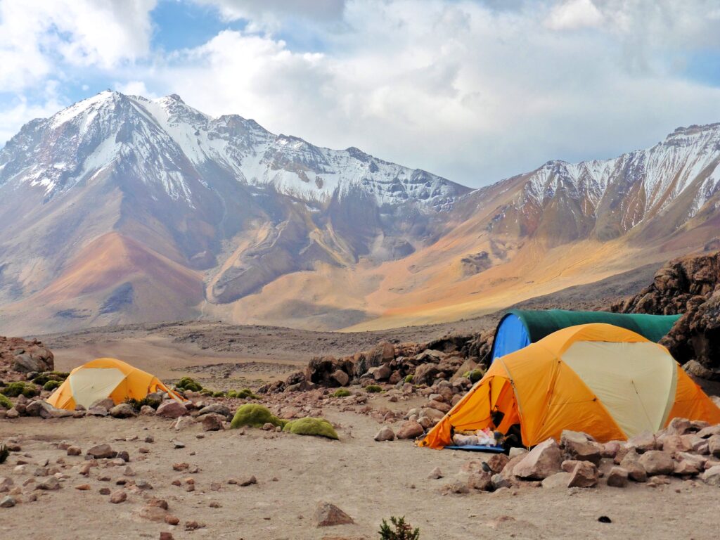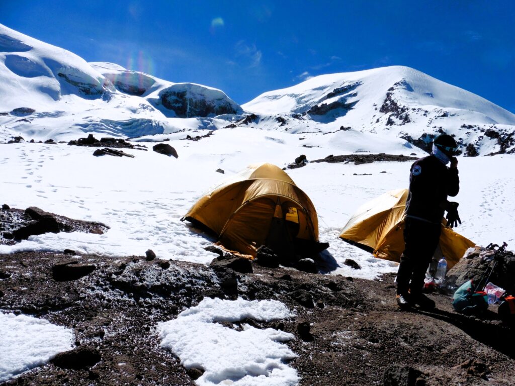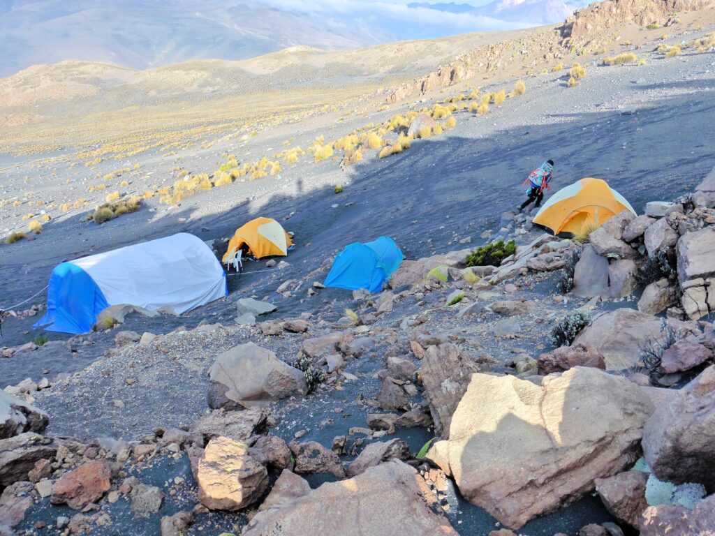 Ascension du Volcan Chachani (6 075 m) : Transfert en 4×4 au Camp de base (4 900 m) et marche jusqu’au Camp de base avancé (5 200 m). Campement. (P, PR, Dî)