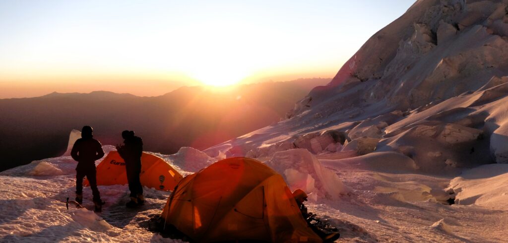 HUASCARÁN: Despertar temprano (5 am) para salir a las 6 am hacia el Campo II (5980 m), escalando la «canal de hielo». A veces hay dificultades por las grietas; tras cruzar la zona de avalanchas antes del amanecer, llegaremos al Campo II antes del mediodía. Tiempo para descansar y preparar el ascenso del día siguiente.